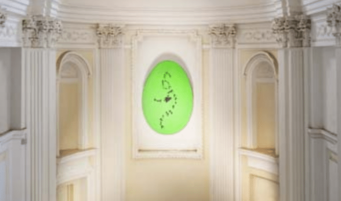 La forza del colore, lo squillante verde mela di questa opera, tassello fondamentale della omonima serie del ’63-’64, la potenza di quest’immagine che evoca la nascita appaiono dirompenti sulle bianche pareti di Santa Maria Regina della Purità nel complesso dell’ex Conservatorio delle orfane a Terra Murata.