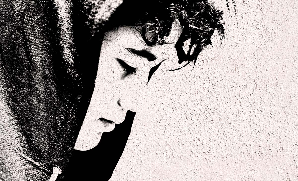 Sad troubled school boy teenager wearing a hoodie posing outdoor made like graffiti stencil painting on white concrete wall